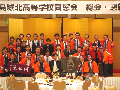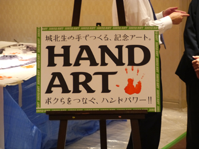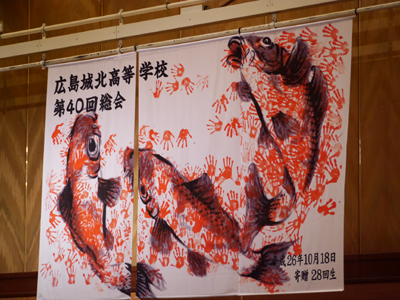 2014年10月18日(土)、リーガロイヤルホテル広島にて、第40回同窓会総会・懇親会が開催されました。今年は、「SHAKE HANDS〜城北生よ、つながろう〜」をテーマとし、300名を越える同窓生の皆様にご参加いただきました。アトラクションの一つである「ハンドアート」。城北健男児の手形で大鯉が完成しました。